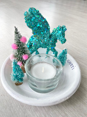 bunt-glitzernder Kerzenhalter mit diversen Tierchen (siehe unten).